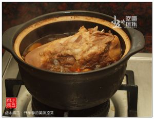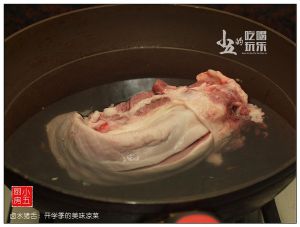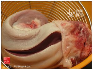 砂锅中加入能淹没猪舌的清水,辣椒、香叶、八角与生姜,一碗生抽,大火煮开。