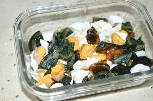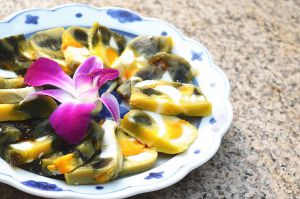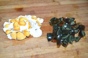 将熟鸭蛋和皮蛋分别切成小块备用;