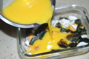 将打散的鸡蛋倒入碗中,直至把皮蛋和咸鸭蛋淹没;