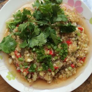 最后再大蒜泥里加入麻油,白糖一点点醋和盐巴.鸡精,花椒.酱油一点点拌匀后浇上去,撒上小葱点缀即可