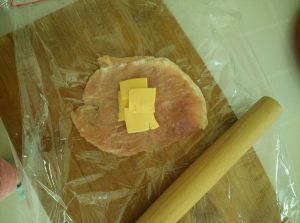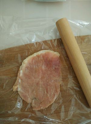 将猪肉用保鲜膜覆盖敲打
