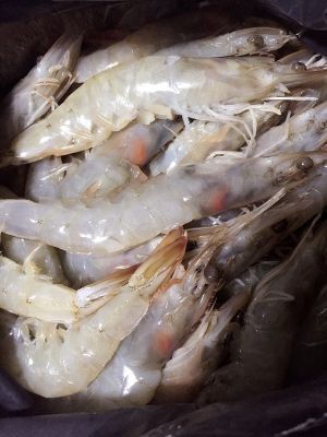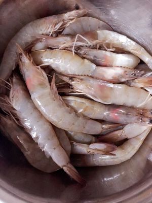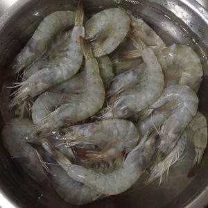 剪去长须,从背部切开,切刀肚皮不切段,去掉背上和肚皮的虾线。