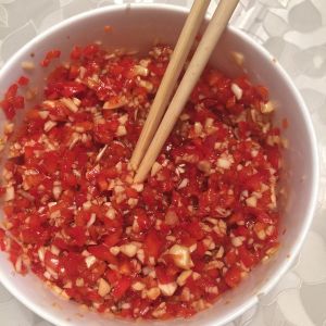 红椒和大蒜切成末,加入少许盐,油,生抽,拌匀。