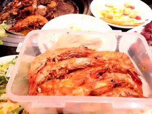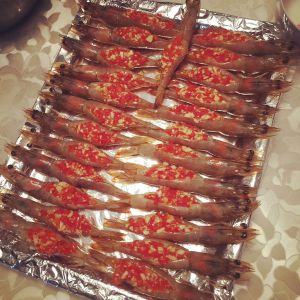 烤盘铺好锡纸或油纸(表面刷少许油),摆好虾,将红椒和大蒜末放进虾背里,虾的表面再刷上油。