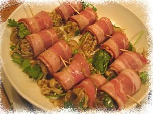 每片培根卷鼓鼓的卷进炒好的金针菇,用牙签固定