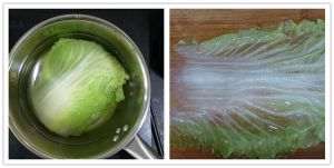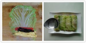 白菜去老叶选择形状完整的大片叶子4片,洗净放入开水中煮软,放凉后将菜帮片薄
