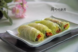 将胡萝卜丝、木耳丝、蛋皮丝放在白菜叶上卷成卷;两端切整齐,在盘中码放整齐;调味料兑成汁,浇在白菜卷上即可。