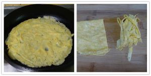 胡萝卜切丝,木耳切丝,将胡萝卜丝、木耳丝放入开水中煮熟,放凉待用。