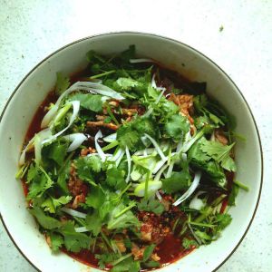 辣椒面,麻椒,撒在肉片上,炒锅烧热油淋在上面,撒上香菜葱丝,香辣的水煮肉片出锅了。