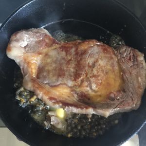 铸铁锅烧到特别热后,放入牛扒,立刻有滋啦滋啦的响声,火力调小,继续煎至