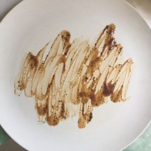 可以摆盘,取一个白色圆盘,黑胡椒酱用刷子随意刷出图案