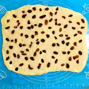 调好的椰蓉均匀的平铺在面饼上,撒上葡萄干和蔓越莓干(不放这两种果干也可以)。