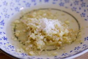 把姜末放入盘子中,同4勺白醋,2勺白糖,1勺盐,1勺料酒进行搅拌均匀。