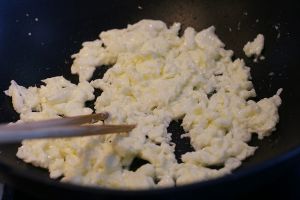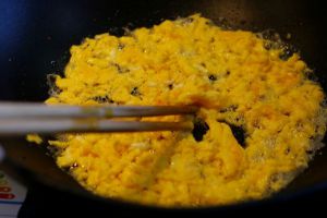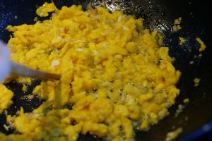 重新起锅,倒油,油热后倒入蛋黄快速滑散。