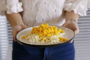 把炒好的蛋黄盖在蛋白上就做好啦。