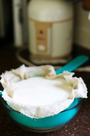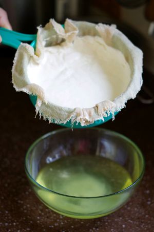 将发酵好的凝乳倒入垫了屉布的过滤网中,置于一个空容器上(如大玻璃碗),过滤乳清;