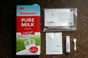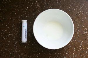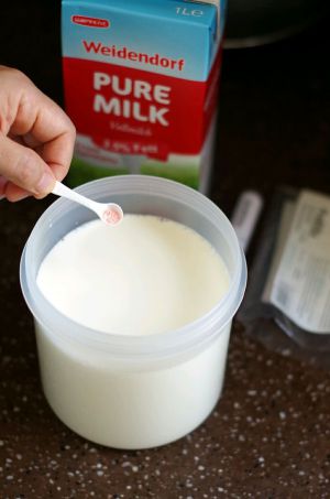 将1升牛奶和半勺(约0.1g)Probida奶酪菌粉以及凝乳酶溶液充分混合均匀;