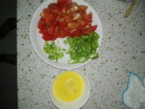 1.西红柿去皮切小块,青椒切圈,选择加一根小葱的原因就是为了煸出香味,一个鸡蛋打碎加一点料酒,去腥。