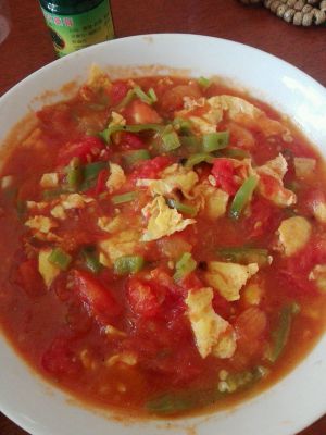 4.完成,个人观点从图片上看喜欢吃西红柿的汁子,所以煸出的汤汁比较多,根本不需要加水,加青椒为了好看,这样吃起来更下饭。喜欢的收藏,不喜欢的无勿喷!谢谢!