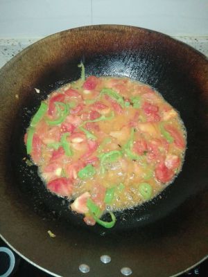 3.小葱煸香以后先放青椒,炒的6分熟,放入西红柿,这期间都是小火,原因是喜欢吃汤的就把西红柿的汁子煸出来,然后放炒好的鸡蛋,再加入盐一勺,白胡椒一小勺,(个人喜欢这样吃)喜欢干的就翻炒两下就可以放鸡蛋了,