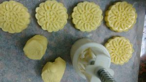 南瓜泥煮好后加适量白砂糖糯米粉,搅拌均匀揉搓成长条切成一个个小剂子,可以用压模器也可以自己用手搓圆后压扁成饼状。