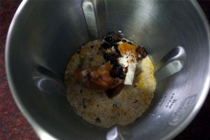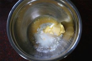 将制作派皮的食材(低筋粉100克、黄油40克、细砂糖10克、全蛋液33克)揉合。