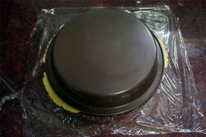 在面团上方铺上一片保鲜膜,然后用派盘中心按压面团至扁。