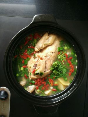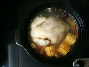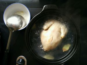 汤煲中加清水,放入姜片,7-8片比较合适,然后放入鸡,大火煮沸,一边用勺子略去浮沫。
