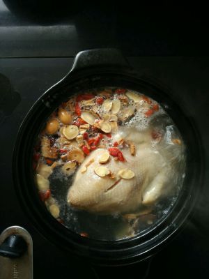 浮沫掠净时放入洗好的药材以及山楂,山楂可以让肉更容易炖烂。再次掠净浮沫,放盐。注意,此时放盐可以使鸡肉入味,但鸡肉肉质会不够嫩,追求肉质口感的人也可以最后一步放盐。