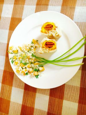 2、香肠、鸡蛋煎好盛起,鸡蛋切片条,根据自己买的吐司大小而定