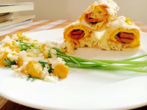 3、吐司平铺摆好,抹上适量千岛酱,然后放上鸡蛋香肠,缓缓卷起,切块
