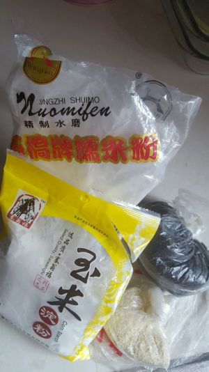 把糯米粉、玉米淀粉、白糖慢慢加入水(可以加点奶粉,吃起来更香)搅拌,一边加水一边用手团成团。