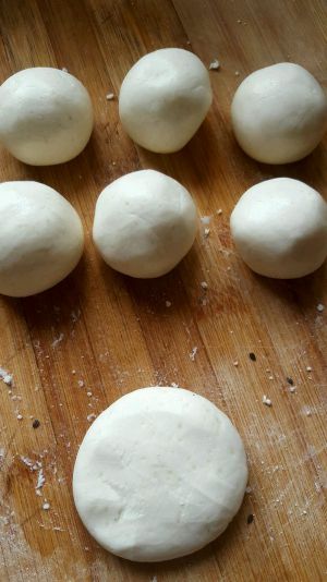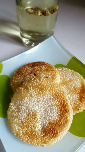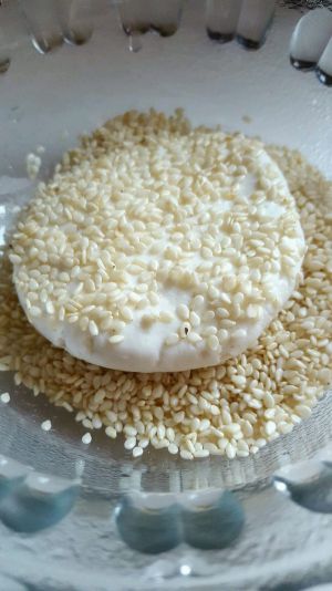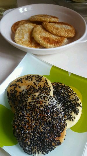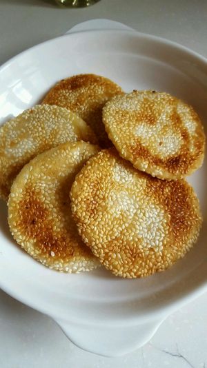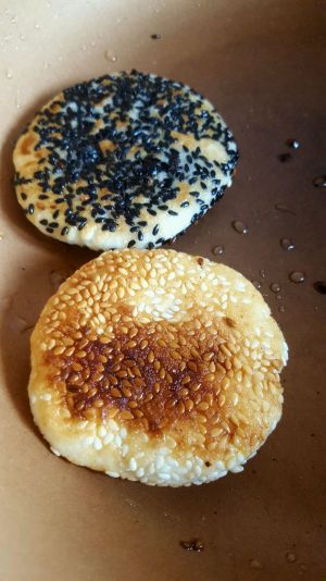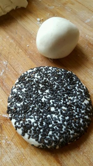 小团子压扁沾上芝麻(黑白芝麻都可以),压的扁一些,这样油不用放太多,很快就熟,用手把芝麻压实,炸的时候不会掉下来。