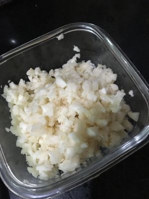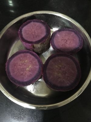 紫薯先蒸熟再切一小粒一小粒,备用(紫薯先切块再蒸熟也可以,不过我喜欢先蒸熟好剥皮)