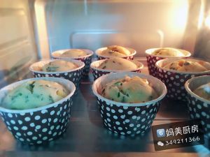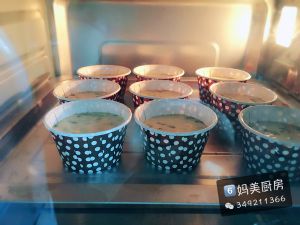 每个纸杯装7-8分满入烤箱,烤箱在准备食材时就开始预热。