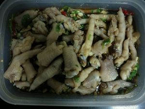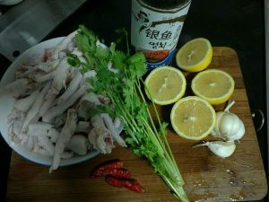 干净容器里放入生抽、陈醋、鱼露、糖、香油、倒入预先备好的各类蒜辣椒等,调匀;再加入冰水中泡过的鸡爪。
