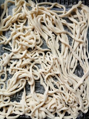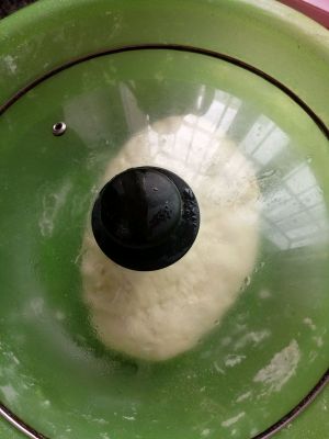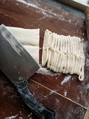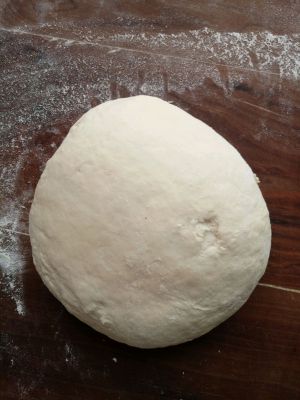 醒完之后,把面放在案板上,揉搓几下,然后,用擀面杖擀成饼状,记住不要擀太薄,那样容易粘一起。