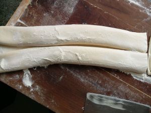 弄好以后,我们就对卷起来记住里面一定放多多的面粉,免得粘上。然后,拿刀,切成自己接受的了的宽度。