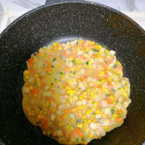 将所有的蔬菜丁放到一起,加入一勺面粉,三颗鸡蛋