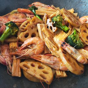 准备自己喜欢的食材,我是家里有什么用什么!虾,藕片,西蓝花,腐竹