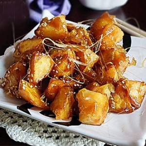 撒上芝麻,使地瓜均匀地裹上糖汁。