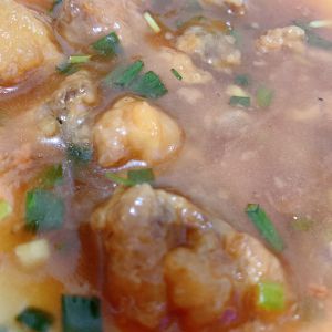 一边缓缓倒入藕粉一边不停搅拌,待汤汁稠一点撒葱花。即可出锅