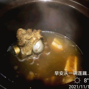 排骨汤炖半小时后,入腌好的莲藕,再炖1个半小时左右;出锅前,放入少许盐和白胡椒粉;