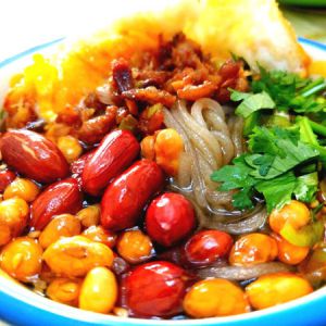 先放入调料。再放红薯粉。再倒入热汤。放入鸡蛋+花生黄豆+肉沫+香菜+黄瓜。
