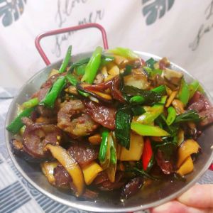 广式腊肠炒香下土家腊肠,蒜白辣椒圈爆香