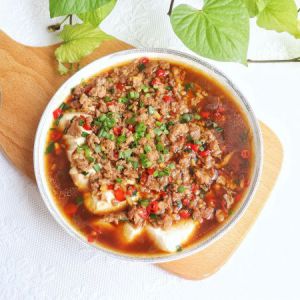 将炒好的肉末均匀淋至豆腐鸡蛋碗中,撒上葱花,稍微翻拌即可食用。