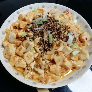 将花椒麻椒碎撒在豆腐上,淋入适量的热油。
