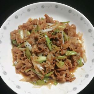 下入大葱快速翻炒。