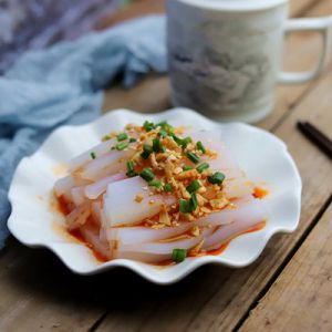 浇调好的油辣子和小葱浇在凉粉上即可。
