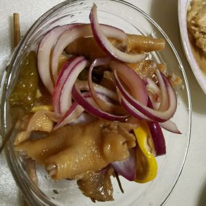 煮鸡爪的时候,准备配料,洋葱切丝,柠檬切片,姜切丝,蒜切碎,泡椒切碎,好入味